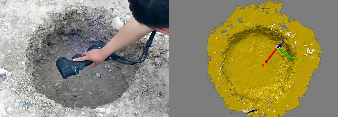 ◎使用MarvelScan掃描在機(jī)場(chǎng)地基上挖出的土坑,以高達(dá)135萬次測(cè)量/秒的速率,可以一次性精準(zhǔn)、迅速完成不規(guī)則土坑的三維數(shù)據(jù)采集,且數(shù)據(jù)方便傳輸與保存,具有永久可追溯性;