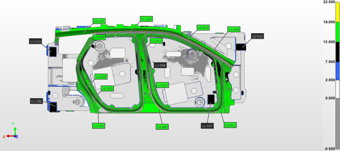 ▲將三維檢測數(shù)據(jù)與原數(shù)模進(jìn)行比對,得到各位置的加工余量。汽車側(cè)門模具加工余量色彩差圖(檢測報告部分示意)