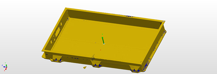 電池底板孔位及外型尺寸,掃描耗時5分鐘,完成數(shù)據(jù)檢測及報告,耗時10分鐘,并且掃描作業(yè)及檢測過程可實現(xiàn)自動化,一鍵可完成自動化出檢測報告。